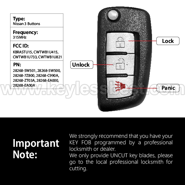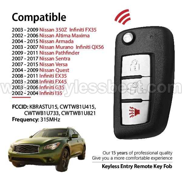 *The detailed information of this 2002-2017 Infiniti Nissan keyless remote fob is as follows. Please confirm the following details match your vehicle before ordering: FCC ID , Part Number , Year Model ,IC, Frequency, Chip, and Buttons.
