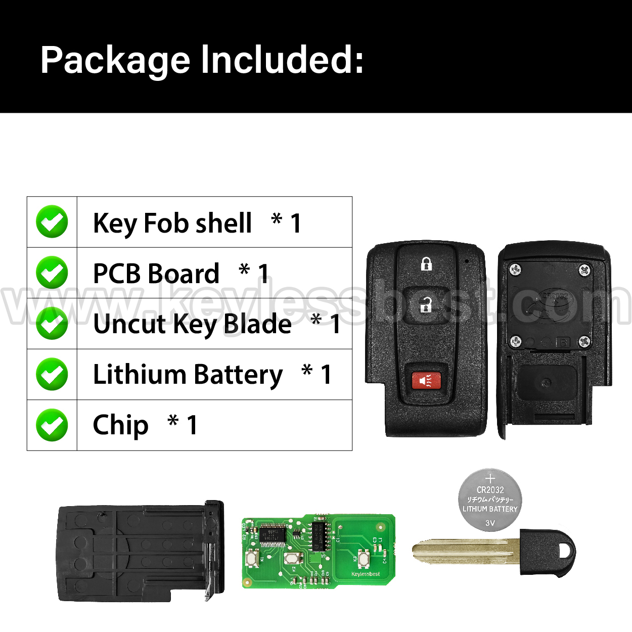 - The 2004-2009 Toyota smart keyless entry fob replacement – without a logo, with an uncut emergency insert key included.