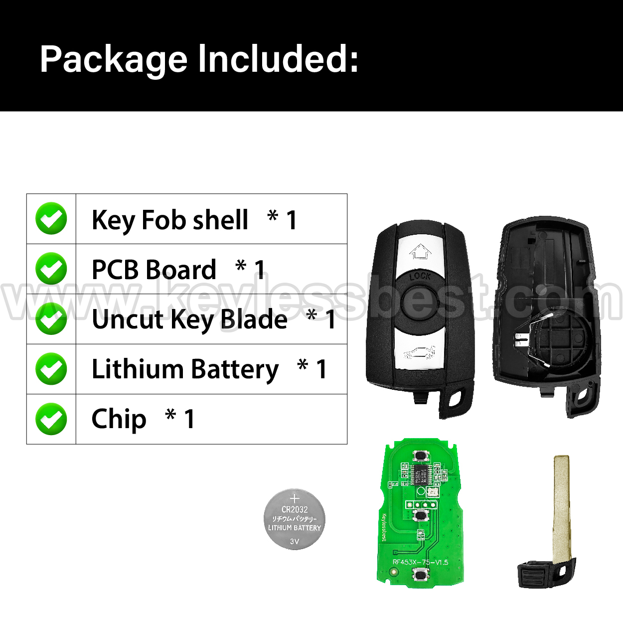 - The 2004-2016 BMW smart keyless entry fob replacement – without a logo, with an uncut emergency insert key included.