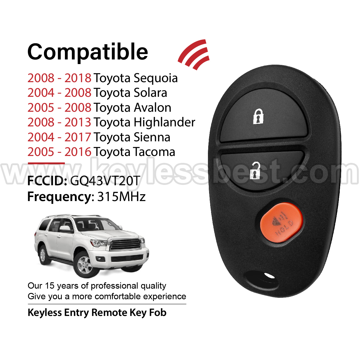 2004-2018 Toyota Sequoia Solara Avalon Highlander Sienna Tacoma / 3 Buttons Keyless Entry Remote / GQ43VT20T / PN: 89742-AE010, 89742-AE011