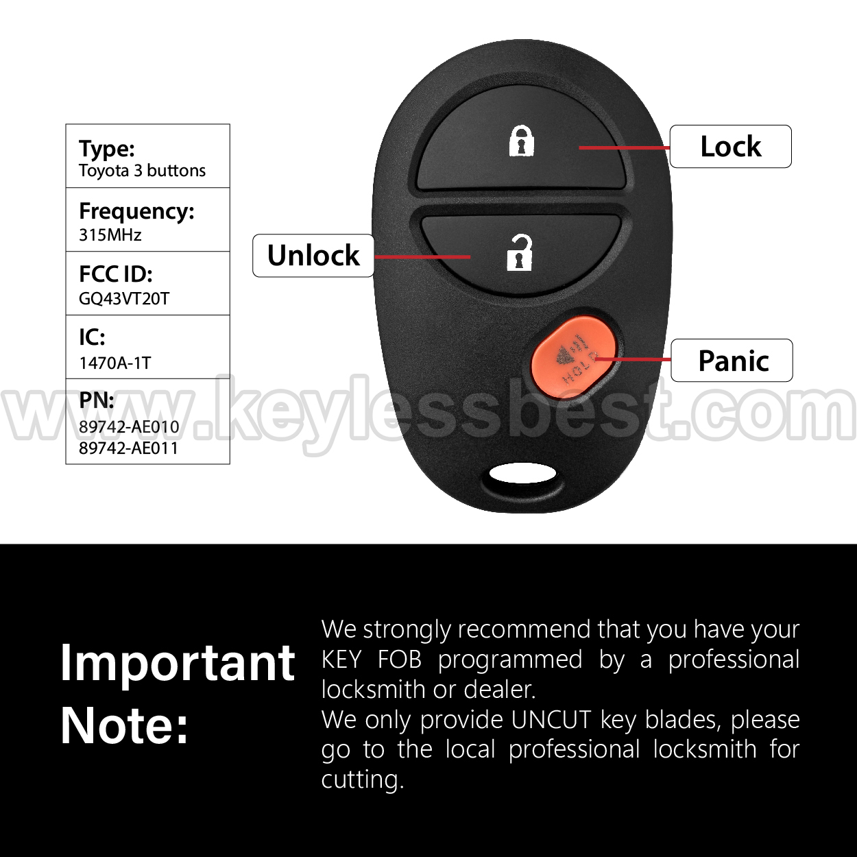 - Therefore, we strongly recommend that you have your KEY FOB programmed by a professional locksmith or dealer.