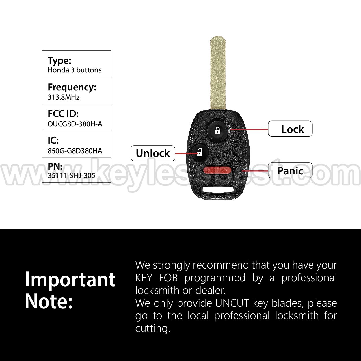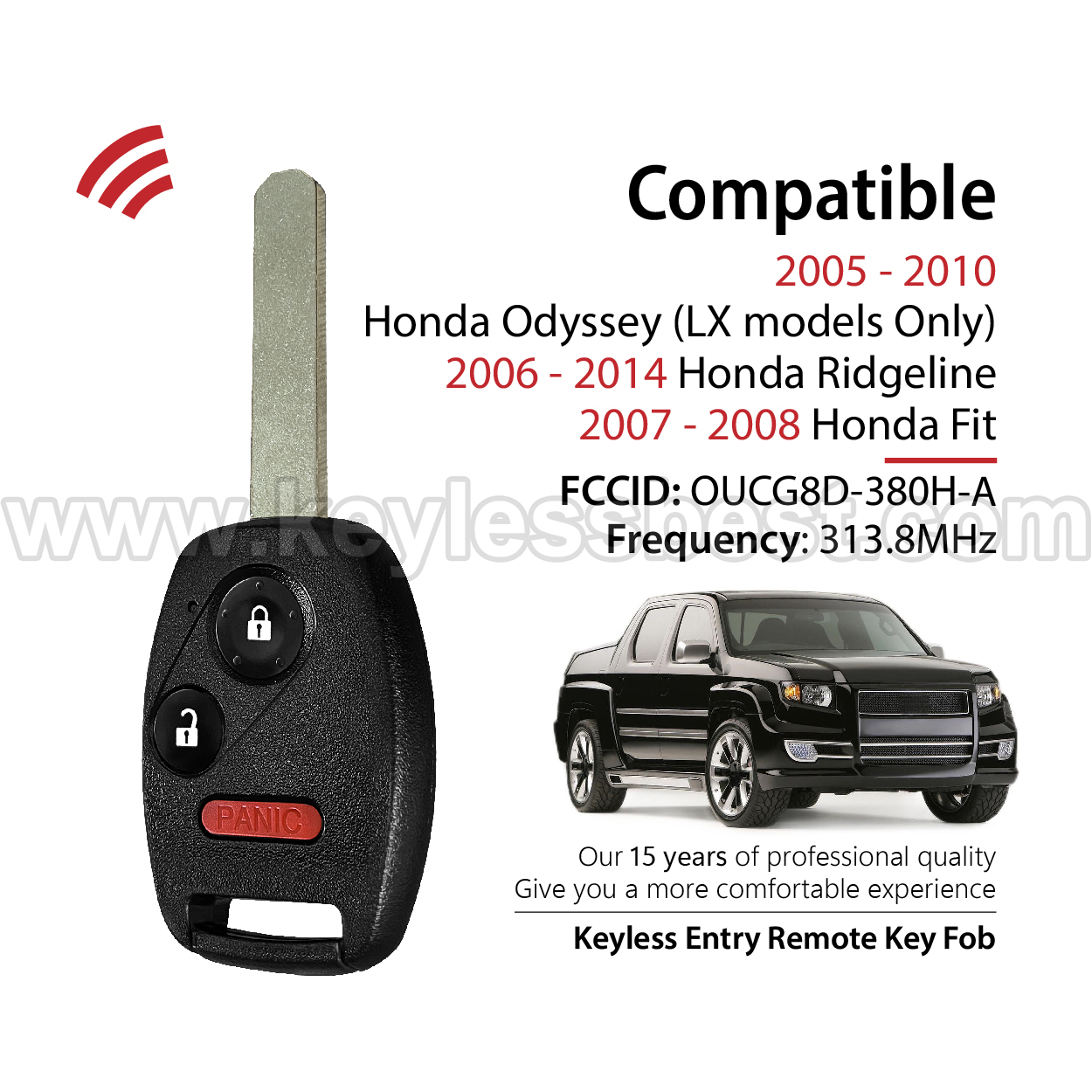 *The detailed information of this 2005-2014 Honda keyless remote fob is as follows. Please confirm the following details match your vehicle before ordering: FCC ID , Part Number , Year Model ,IC, Frequency, Chip, and Buttons.
