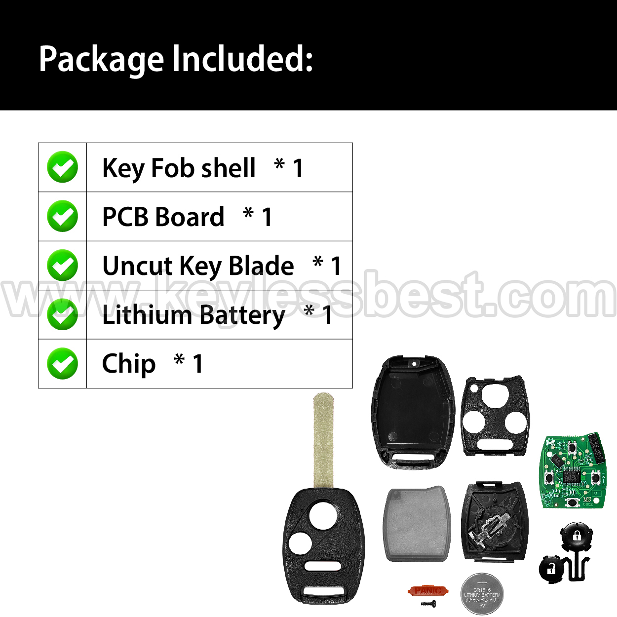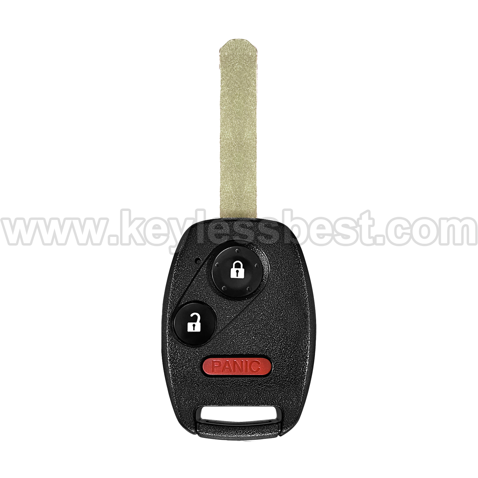 - The 2005-2014 Honda smart keyless entry fob replacement – without a logo, with an uncut emergency insert key included.