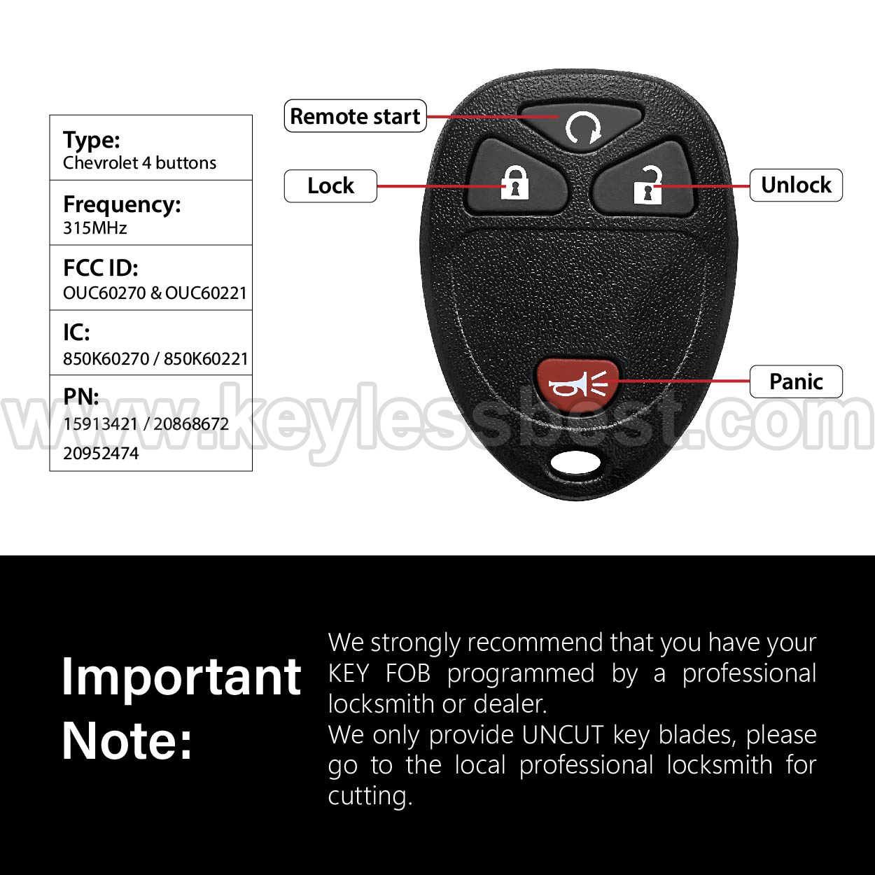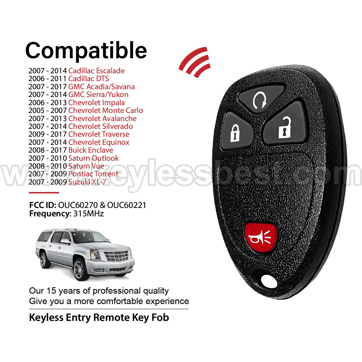 2005-2017 Cadillac GMC Chevrolet Saturn Buick Pontiac Suzuki Escalade / 4 Buttons Keyless Entry Remote / OUC60270 & OUC60221 / PN:15913421, 20868672, 20952474