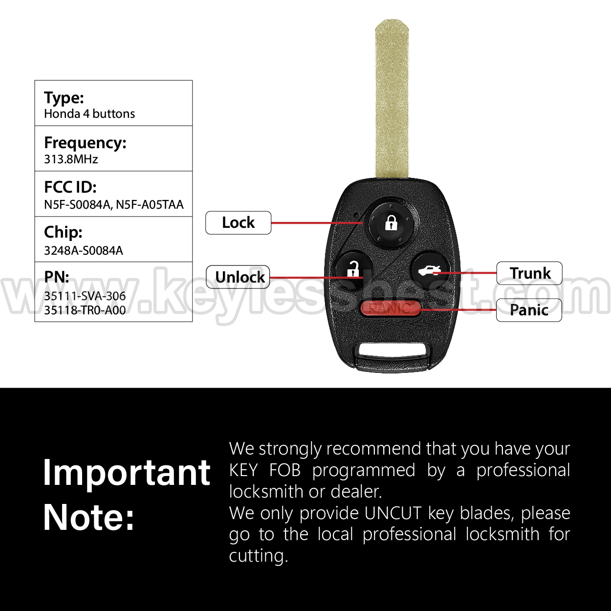 *The detailed information of this 2006-2013 Honda Acura keyless remote fob is as follows. Please confirm the following details match your vehicle before ordering: FCC ID , Part Number , Year Model ,IC, Frequency, Chip, and Buttons.