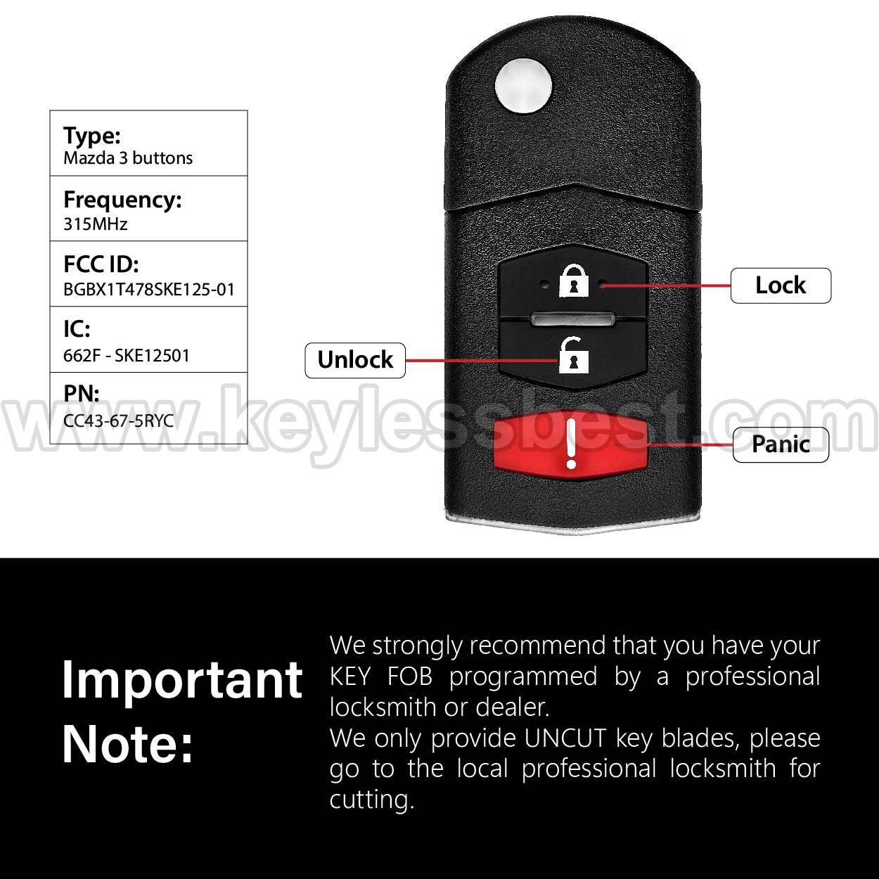 *The detailed information of this 2006-2015 Mazda keyless remote fob is as follows. Please confirm the following details match your vehicle before ordering: FCC ID , Part Number , Year Model ,IC, Frequency, Chip, and Buttons.