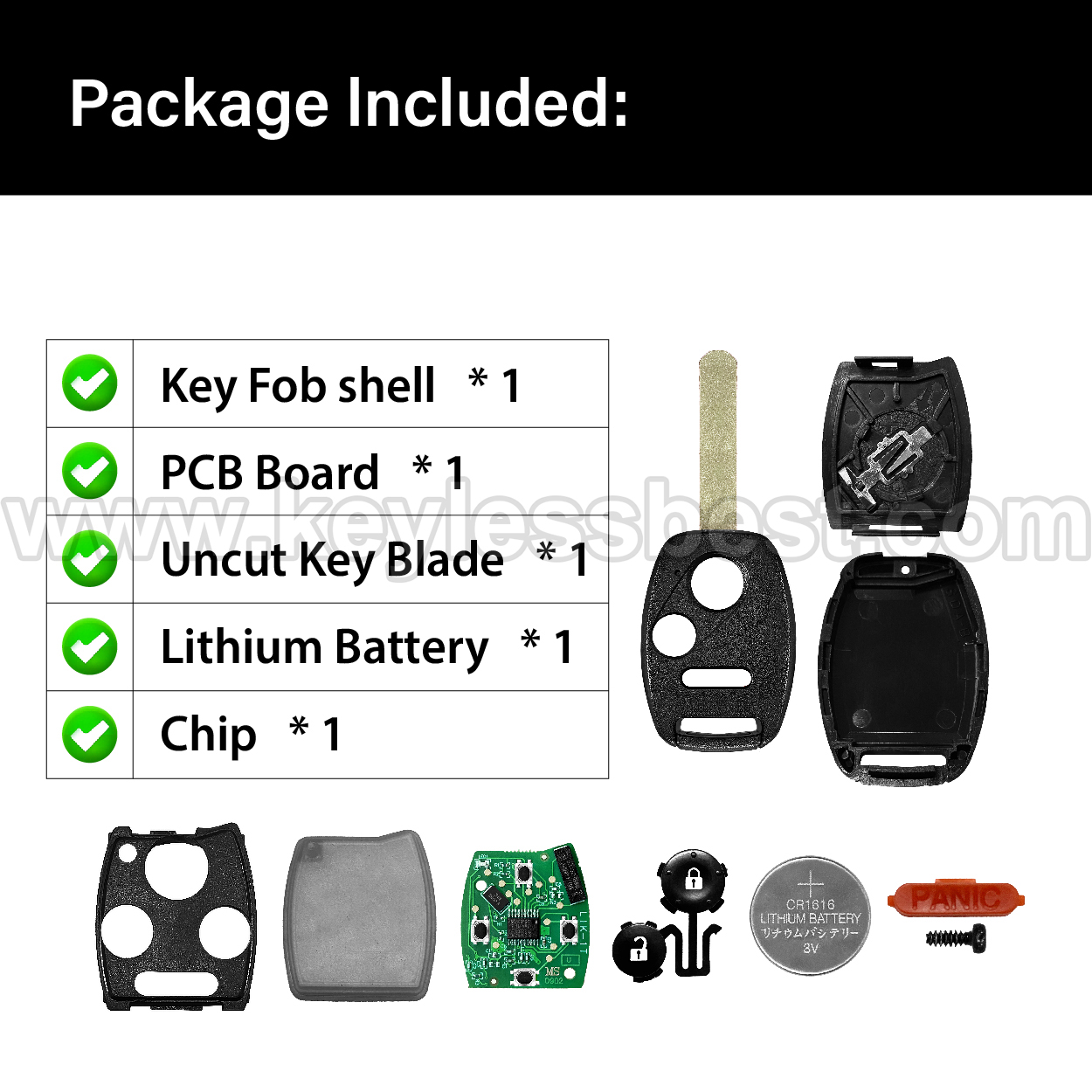 - The 2006-2017 Honda Acura smart keyless entry fob replacement – without a logo, with an uncut emergency insert key included.