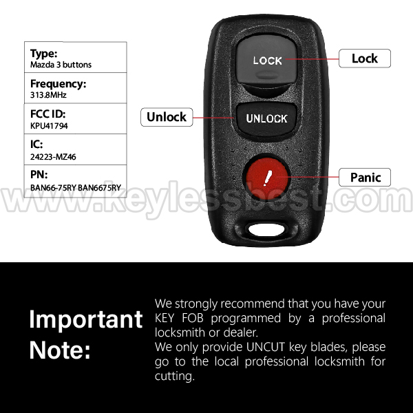 *The detailed information of this 2007 – 2009 Mazda keyless remote fob is as follows. Please confirm the following details match your vehicle before ordering: FCC ID , Part Number , Year Model , IC , Frequency, Chip, and Buttons.