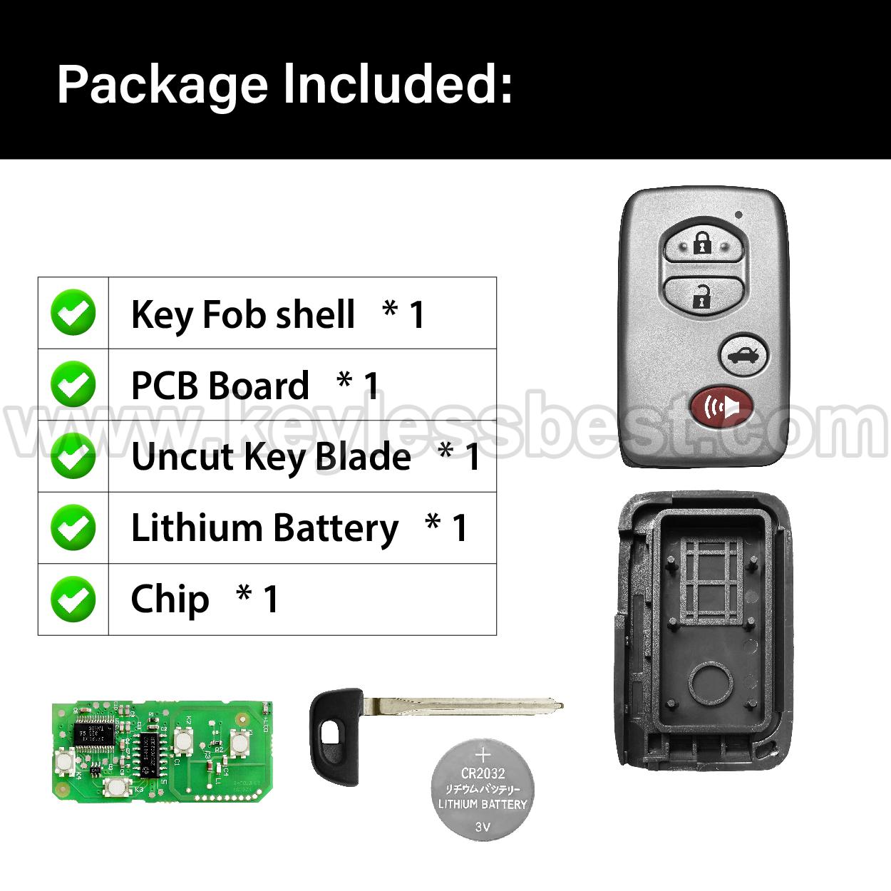 - The 2007-2010 Toyota smart keyless entry fob replacement – without a logo, with an uncut emergency insert key included.