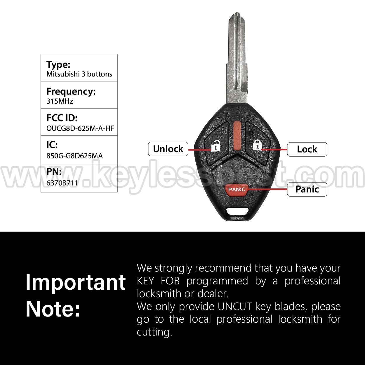 *The detailed information of this 2007 – 2017 Mitsubishi keyless remote fob is as follows. Please confirm the following details match your vehicle before ordering: FCC ID , Part Number , Year Model ,IC, Frequency, Chip, and Buttons.