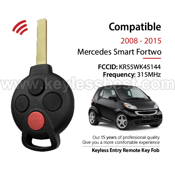 - The 2008-2015 Mercedes smart keyless entry fob replacement – without a logo, with an uncut emergency insert key included.