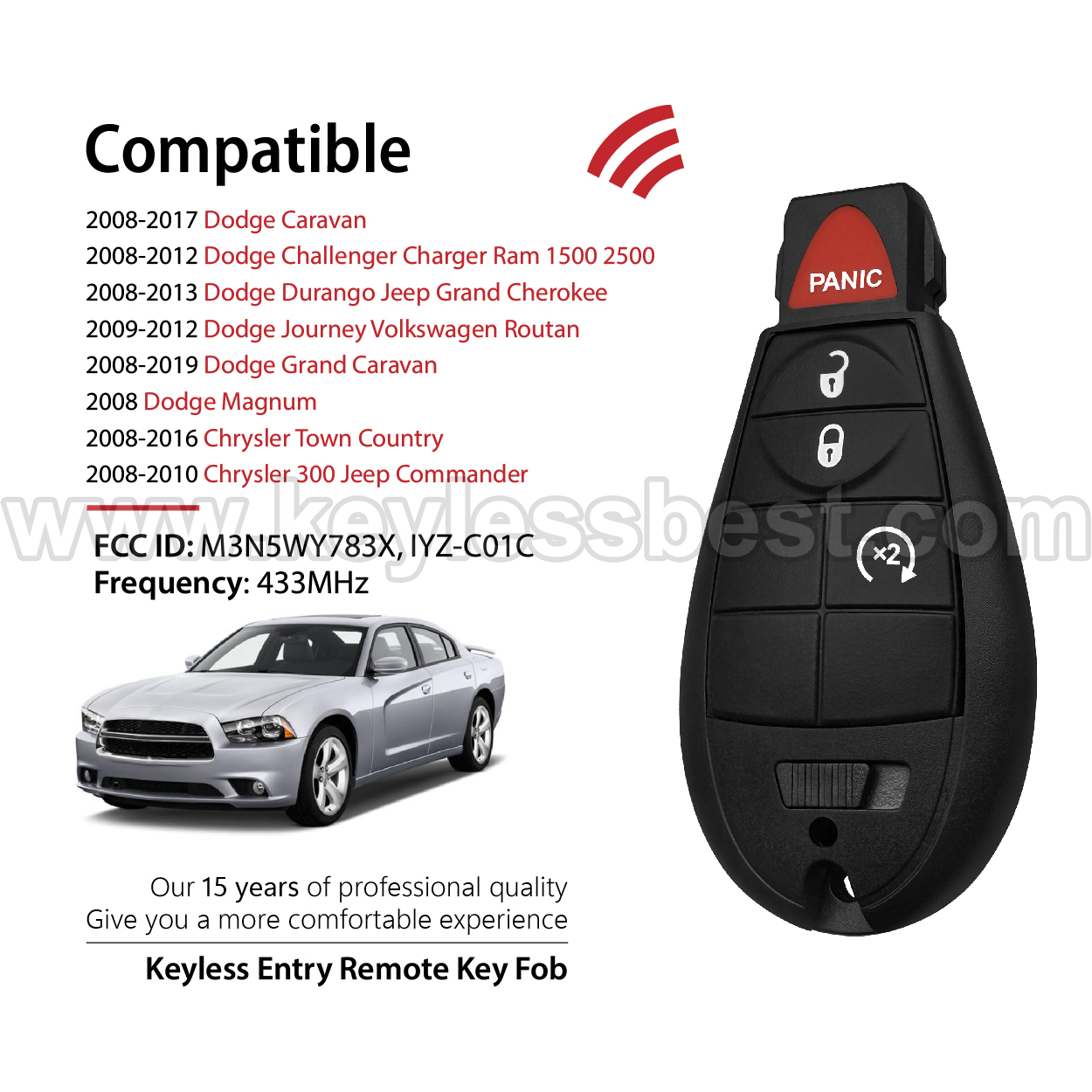 *The detailed information of this 2008-2019 Dodge Chrysler Volkswagen Jeep keyless remote fob is as follows. Please confirm the following details match your vehicle before ordering: FCC ID , Part Number , Year Model , IC , Frequency, Chip, and Buttons.