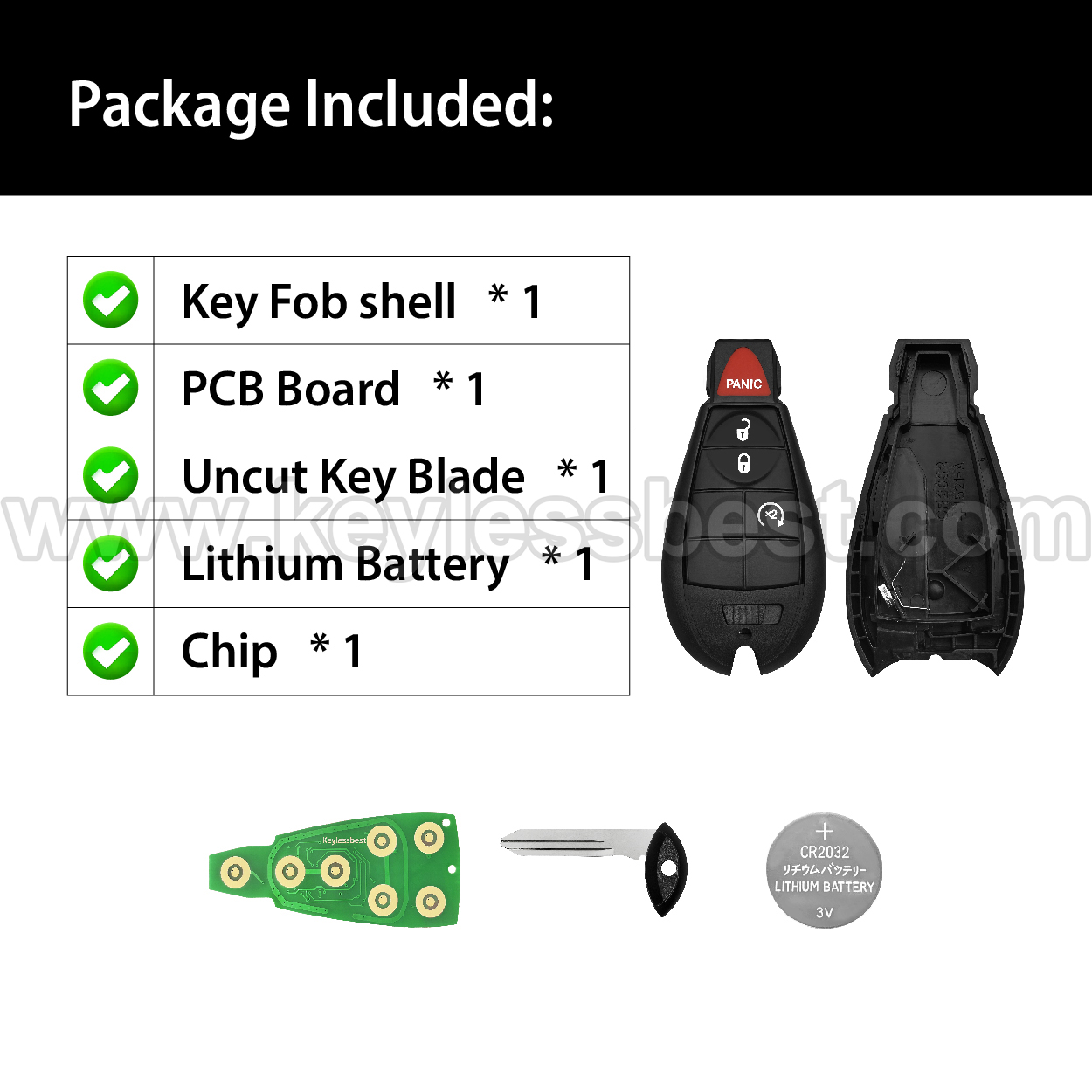 - Price is for onecomplete replacement keyless entry remote, emergency key included.
