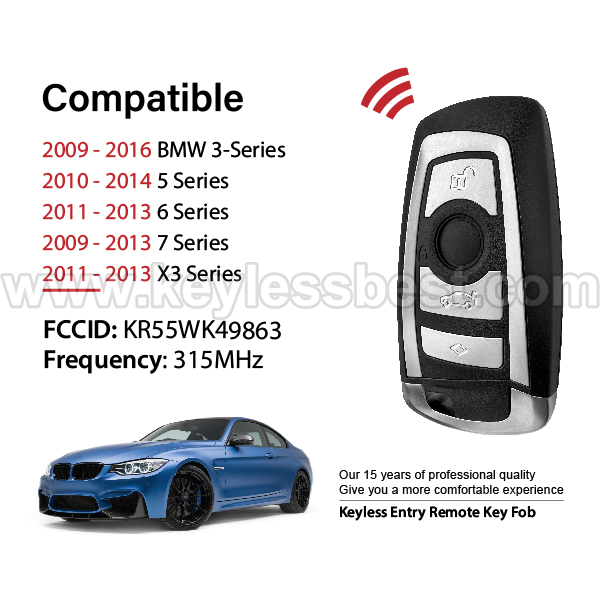 2009-2016 BMW 3-Series 5 Series 6 Series 7 Series X3 Series / 4 Buttons Keyless Entry Remote / KR55WK49863 / ID 49