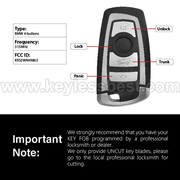 *The detailed information of this 2009 – 2016 BMW keyless remote fob is as follows. Please confirm the following details match your vehicle before ordering: FCC ID , Part Number , Year Model ,IC, Frequency, Chip, and Buttons.
