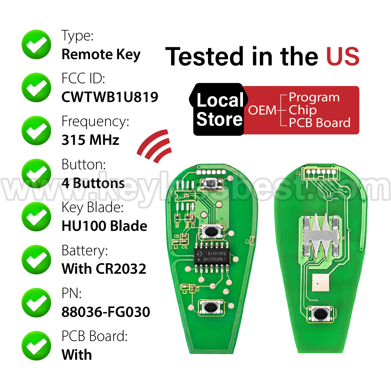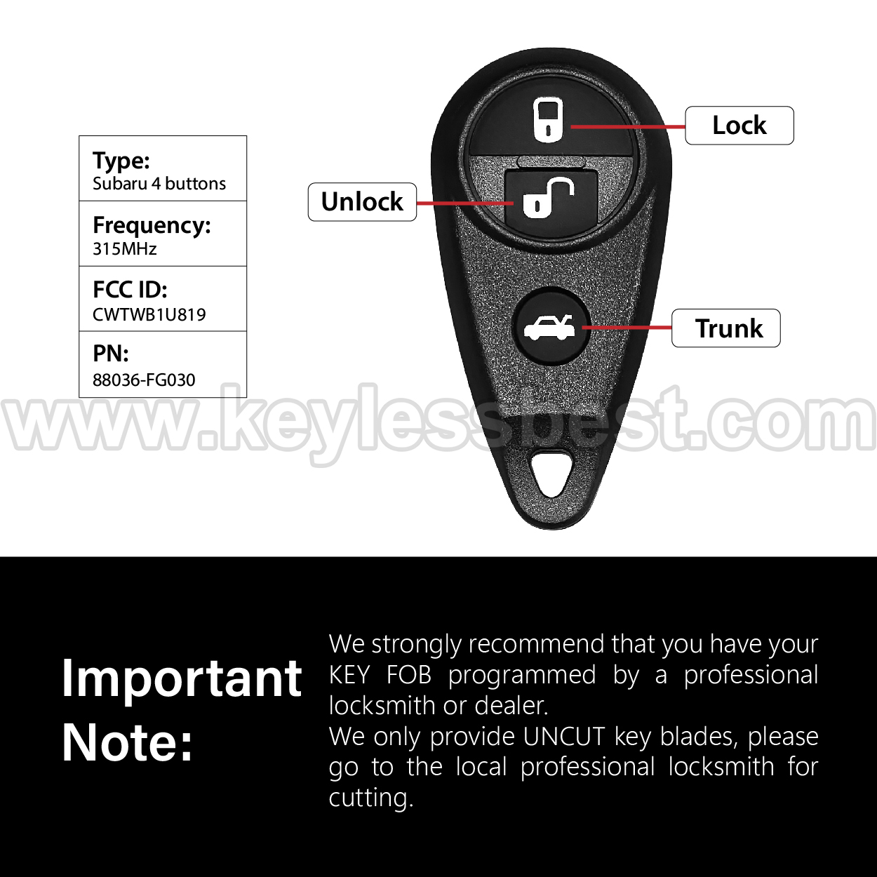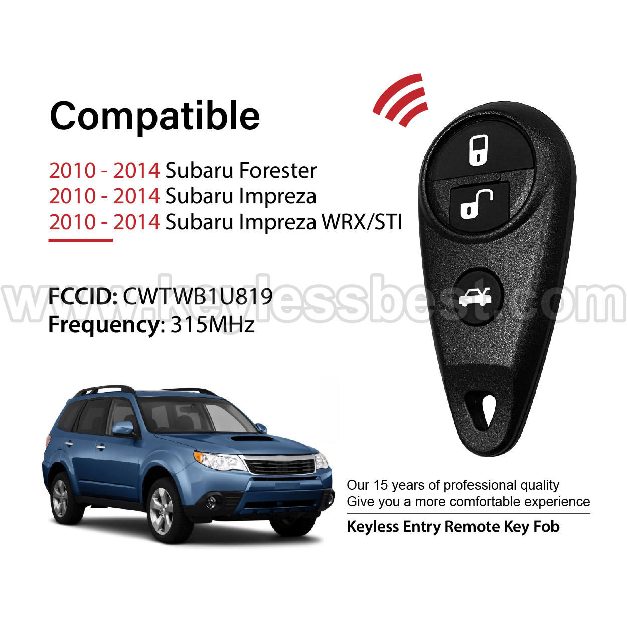 *The detailed information of this 2010-2014 Subaru keyless remote fob is as follows. Please confirm the following details match your vehicle before ordering: FCC ID , Part Number , Year Model ,IC, Frequency, Chip, and Buttons.