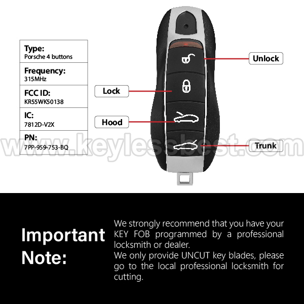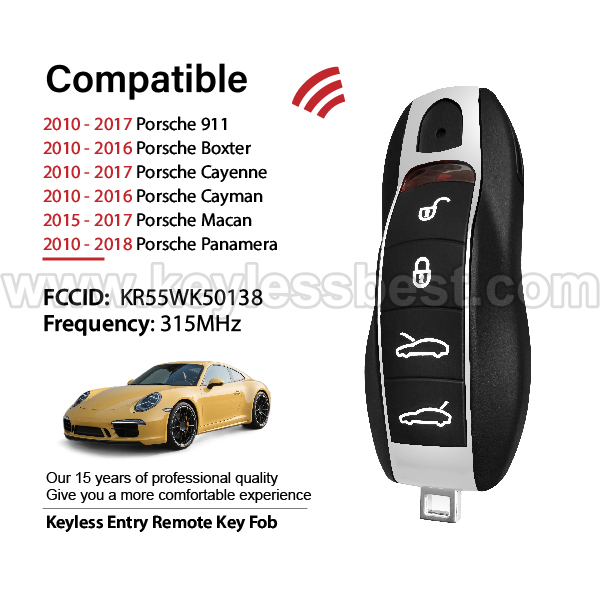 *The detailed information of this 2010 – 2018 Porsche keyless remote fob is as follows. Please confirm the following details match your vehicle before ordering: FCC ID , Part Number , Year Model ,IC, Frequency, Chip, and Buttons.