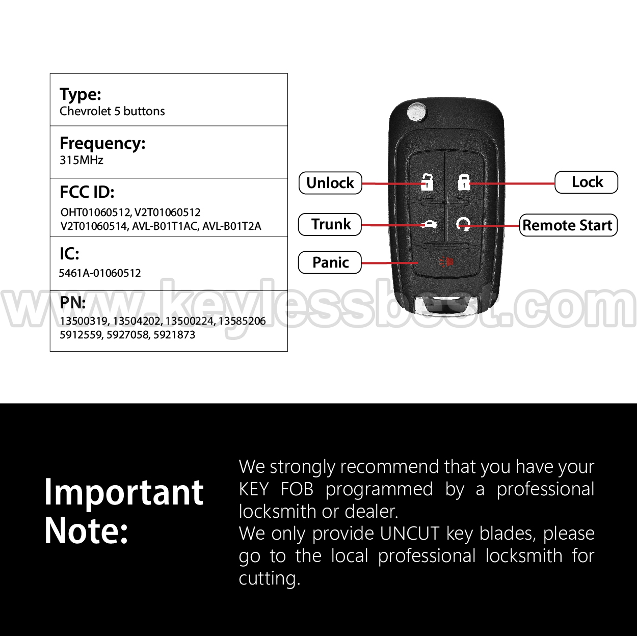 *The detailed information of this 2010-2019 Chevrolet GMC Buick keyless remote fob is as follows. Please confirm the following details match your vehicle before ordering: FCC ID, Part Number, Year Model, IC, Frequency, Chip and Buttons.