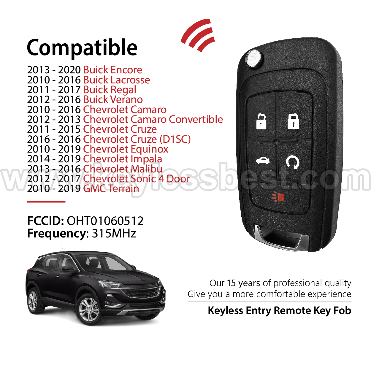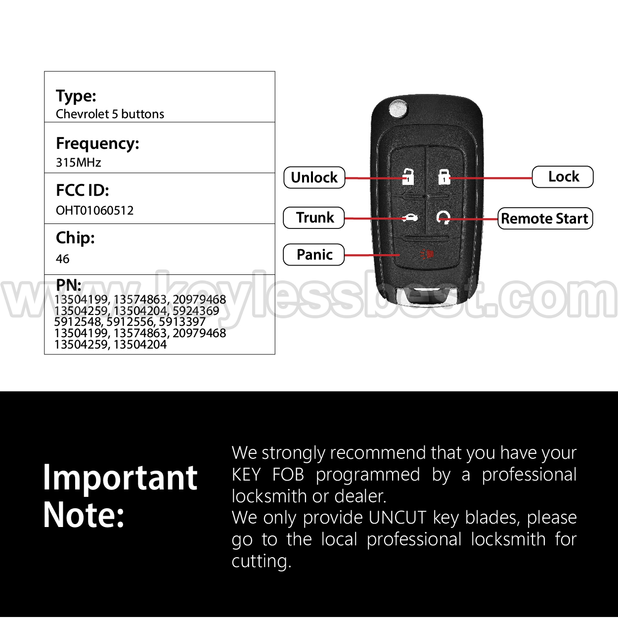 *The detailed information of this 2010-2020 Buick Chevrolet GMC keyless remote fob is as follows. Please confirm the following details match your vehicle before ordering: FCC ID , Part Number , Year Model ,IC, Frequency, Chip, and Buttons.