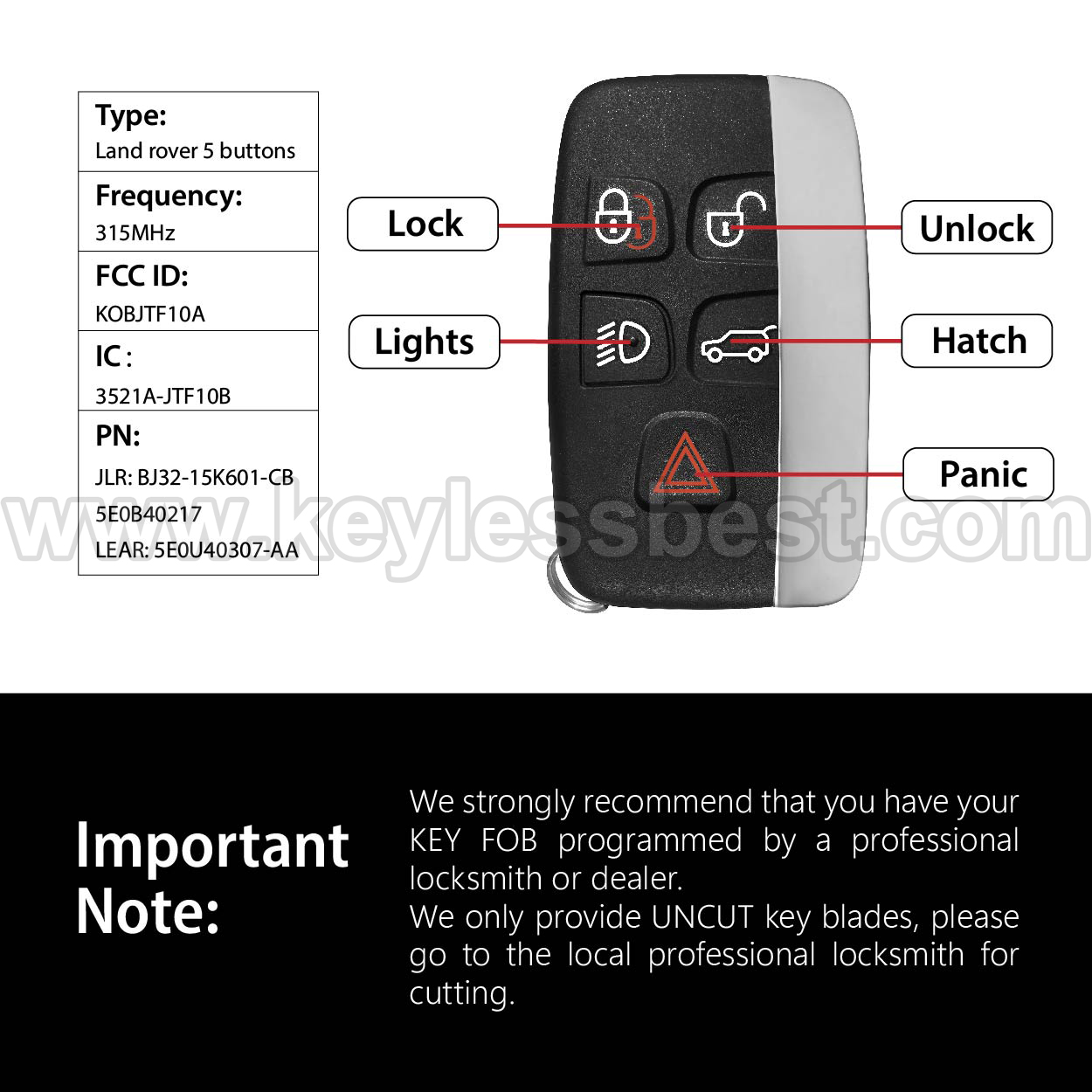 2010-2020 Jaguar Land Rover F-Type XJ XF F-Pace XE LR2 LR4 LR4 Discovery Discovery Sport Range Rover Range Rover Evoque Range Rover Sport Range Rover Velar / 5 Buttons Keyless Entry Remote / KOBJTF10A / PN: JLR: BJ32-15K601-CB 5E0B40217 LEAR: 5E0U40307-AA / 49