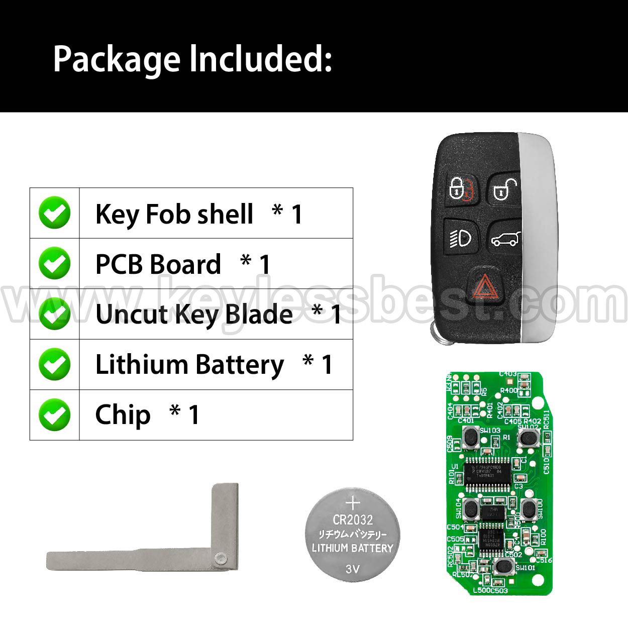 - The 2010-2020 Jaguar Land Rover smart keyless entry fob replacement – without a logo, with an uncut emergency insert key included.