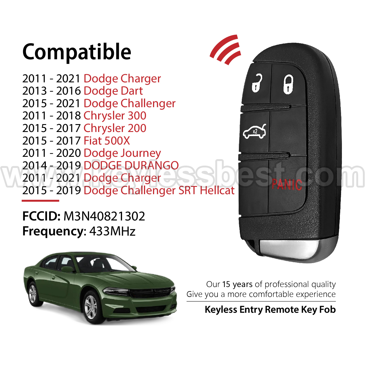 2011 – 2021 Dodge Chrysler Fiat Charger Dart Challenger Journey DURANGO Challenger SRT Hellcat 300 200 500X / 4 Buttons Keyless Entry Remote / M3N40821302 / PN: 68051387AC 68051387AH 68051387 56046768AA 68051387AD / 46