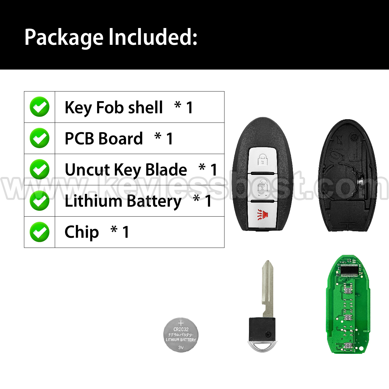 - The 2013-2016 Nissan smart keyless entry fob replacement – without a logo, with an uncut emergency insert key included.