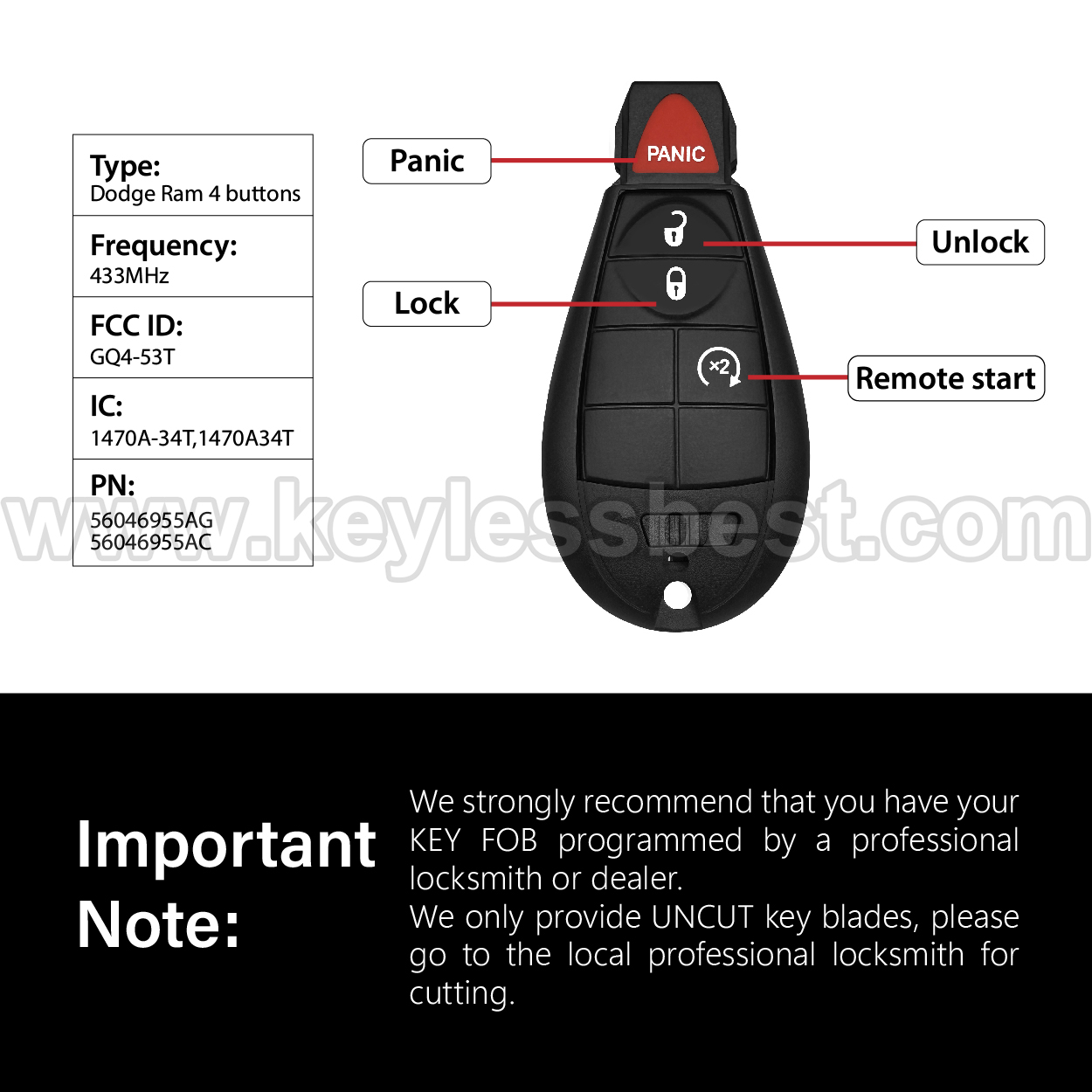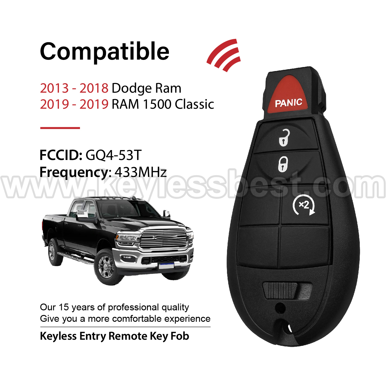 *The detailed information of this 2013-2019 Dodge RAM keyless remote fob is as follows. Please confirm the following details match your vehicle before ordering: FCC ID , Part Number , Year Model ,IC, Frequency, Chip, and Buttons.
