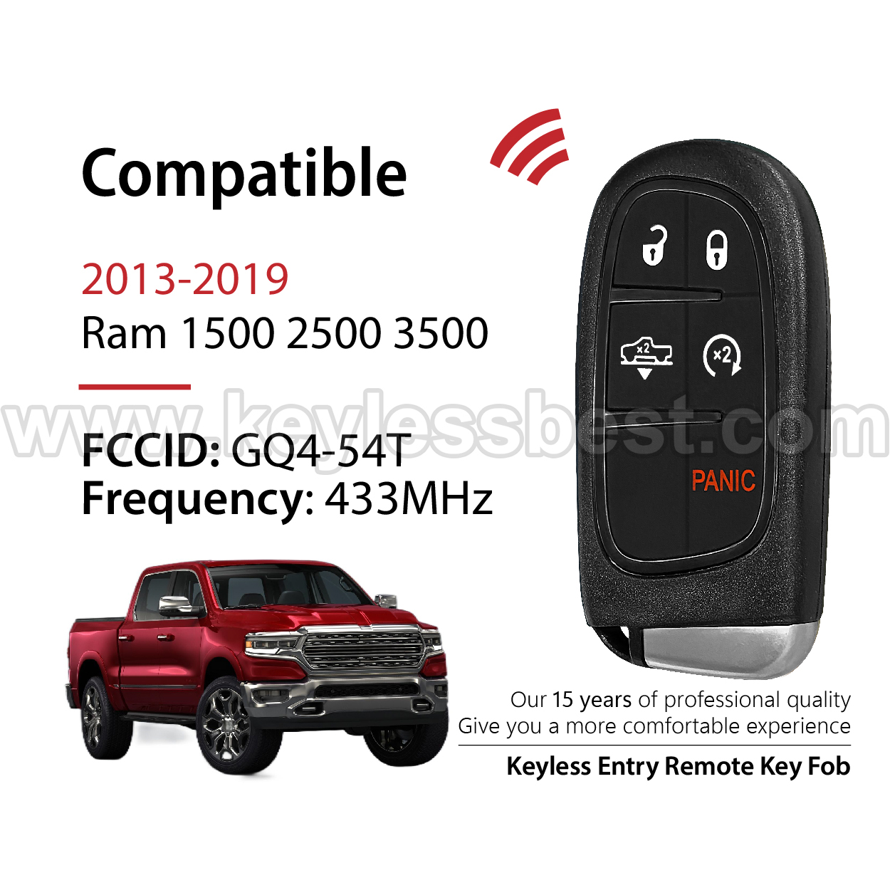 - The 2013-2019 Ram smart keyless entry fob replacement – without a logo, with an uncut emergency insert key included.