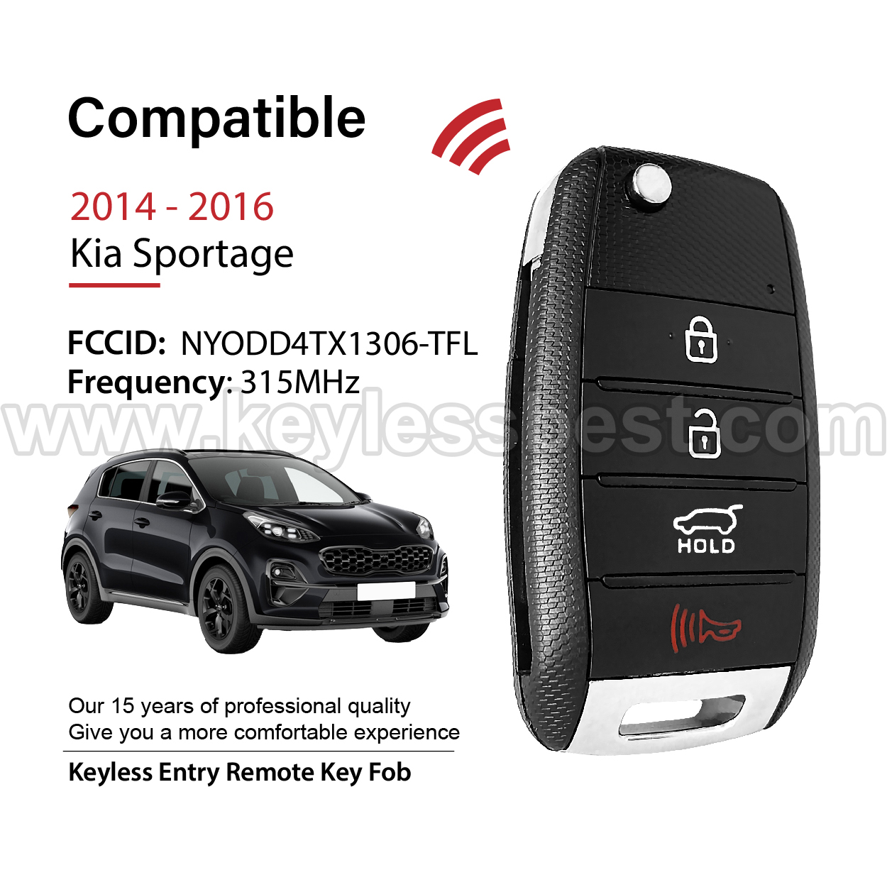 *The detailed information of this 2014 – 2016 Kia keyless remote fob is as follows. Please confirm the following details match your vehicle before ordering: FCC ID , Part Number , Year Model ,IC, Frequency, Chip, and Buttons.