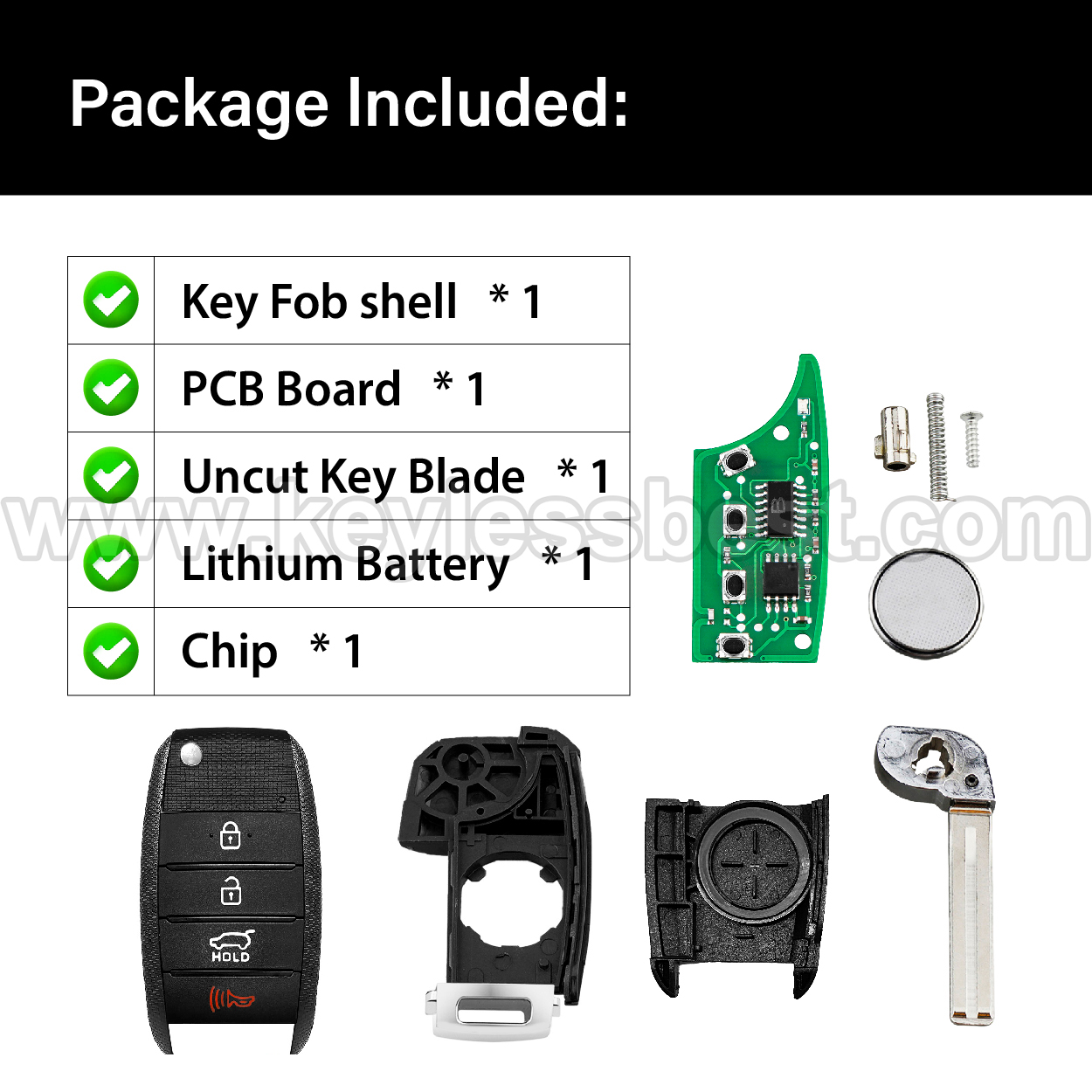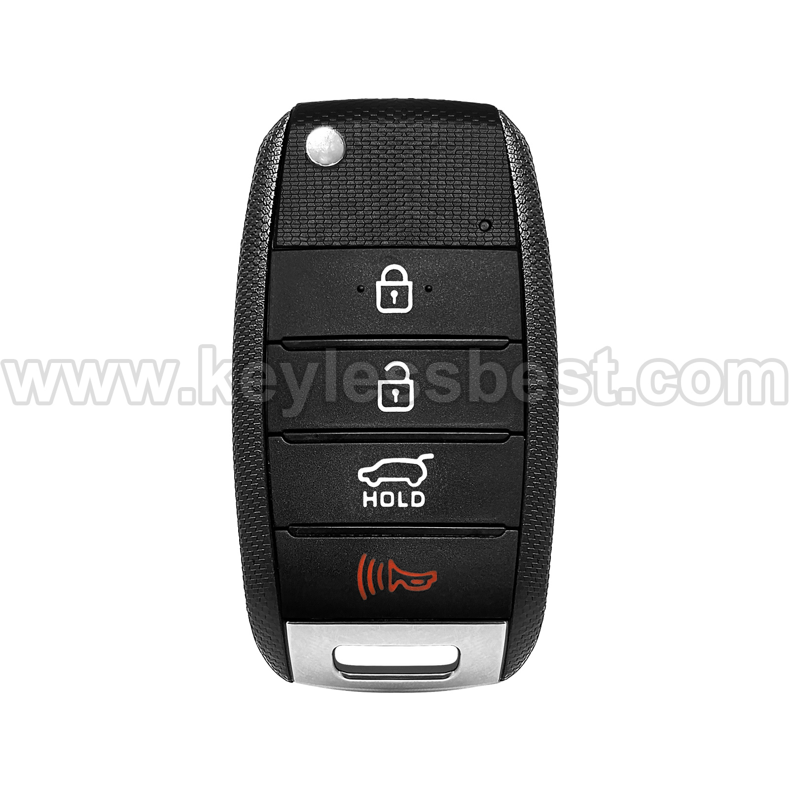 - The 2014 – 2016 Kia smart keyless entry fob replacement – without a logo, with an uncut emergency insert key included.