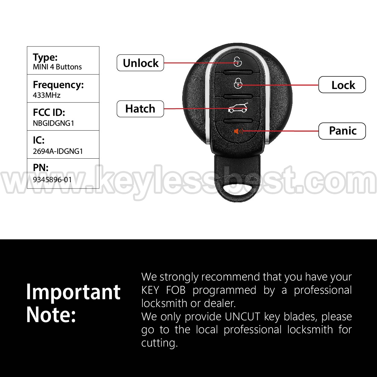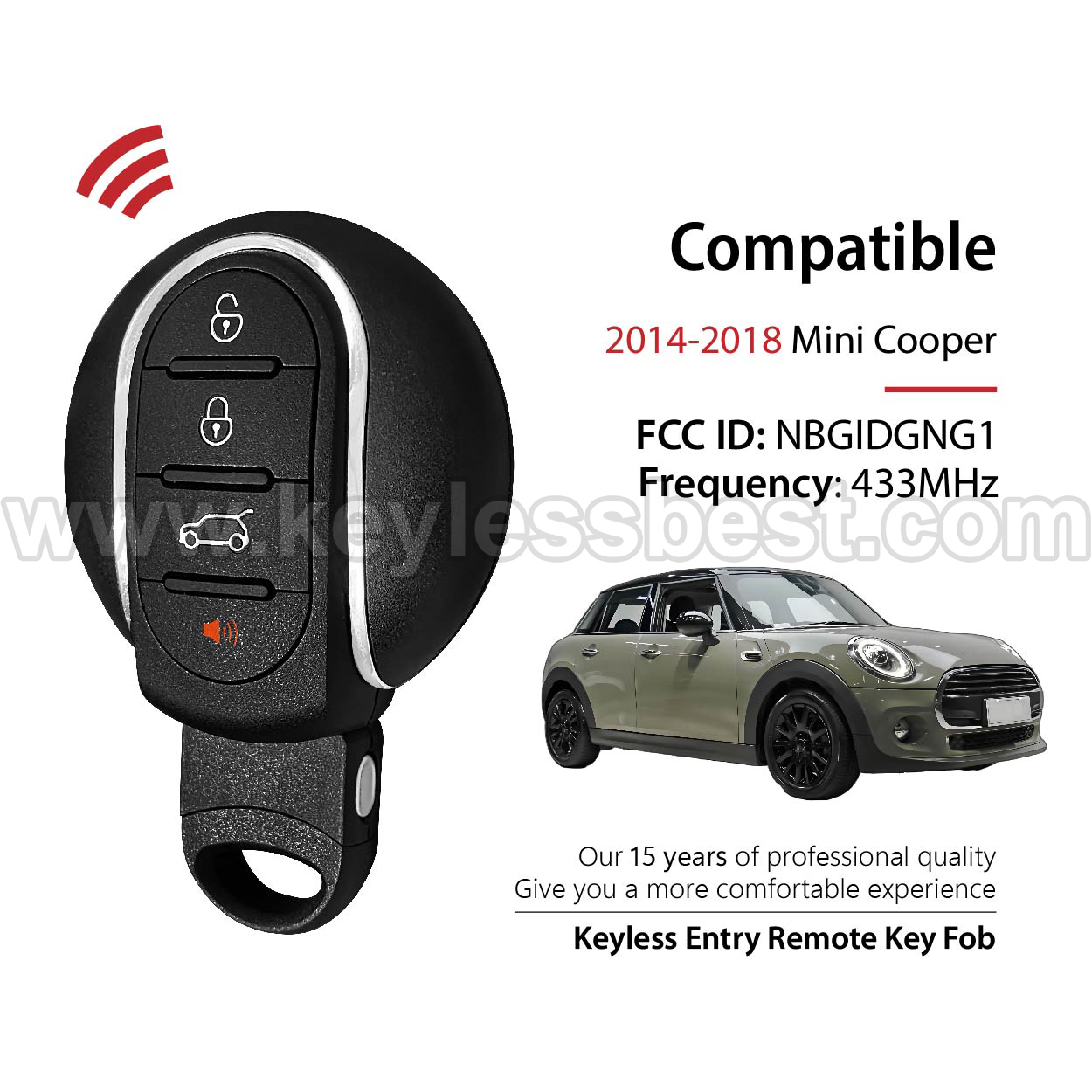 *The detailed information of this 2014-2018 Mini keyless remote fob is as follows. Please confirm the following details match your vehicle before ordering: FCC ID , Part Number , Year Model ,IC, Frequency, Chip, and Buttons.