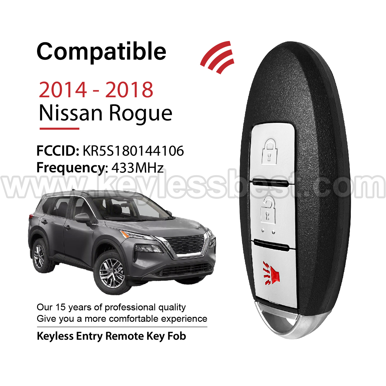 2014 – 2018 Nissan Rogue / 3 Buttons Keyless Entry Remote / KR5S180144106 / PN: 285E3-4CB1C 285E3-4CB1A / 4A