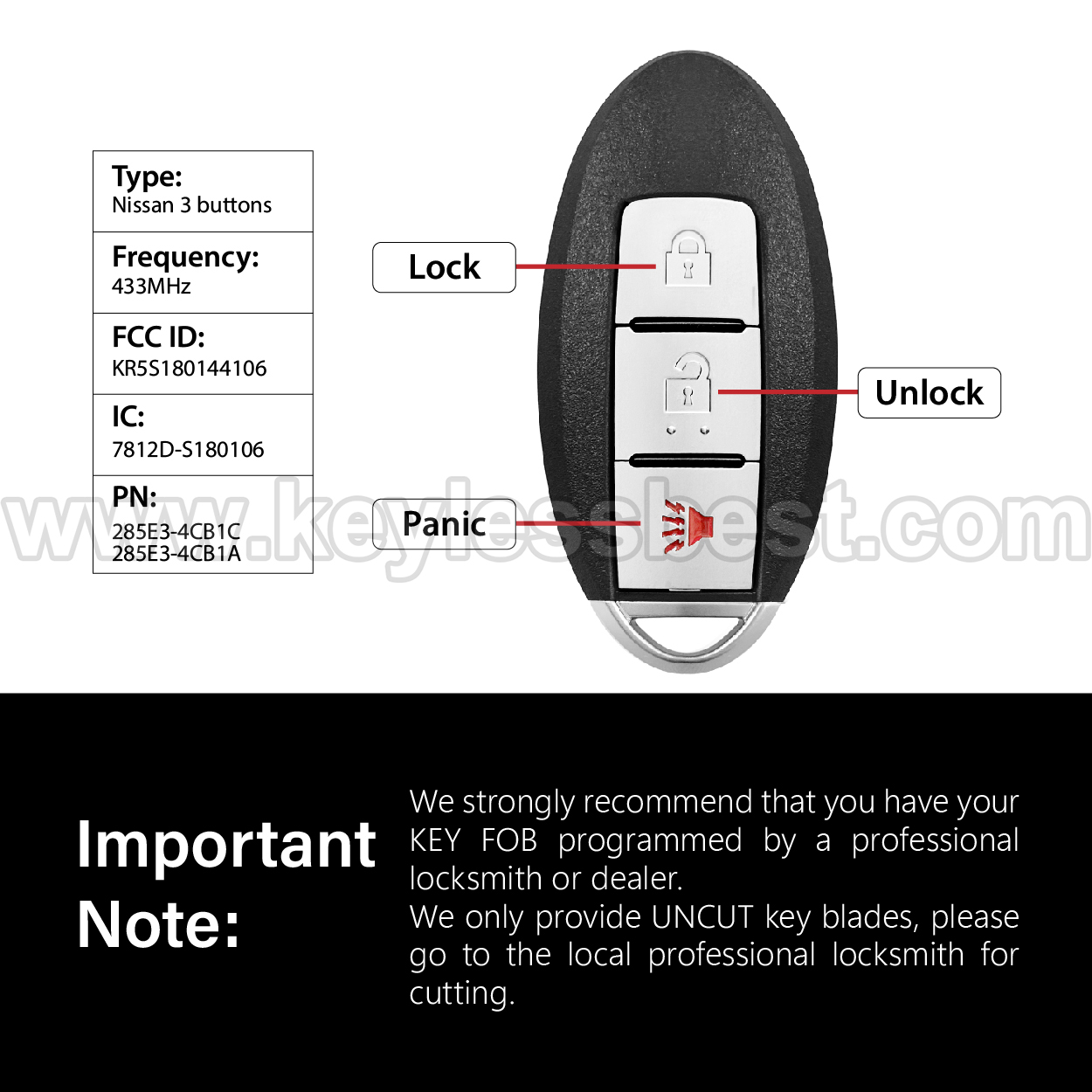 *The detailed information of this 2014 – 2018 Nissan keyless remote fob is as follows. Please confirm the following details match your vehicle before ordering: FCC ID , Part Number , Year Model , IC , Frequency, Chip, and Buttons.