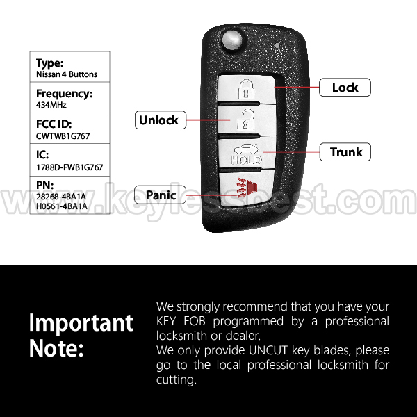 *The detailed information of this 2014-2019 Nissan keyless remote fob is as follows. Please confirm the following details match your vehicle before ordering: FCC ID , Part Number , Year Model , IC , Frequency, Chip, and Buttons.