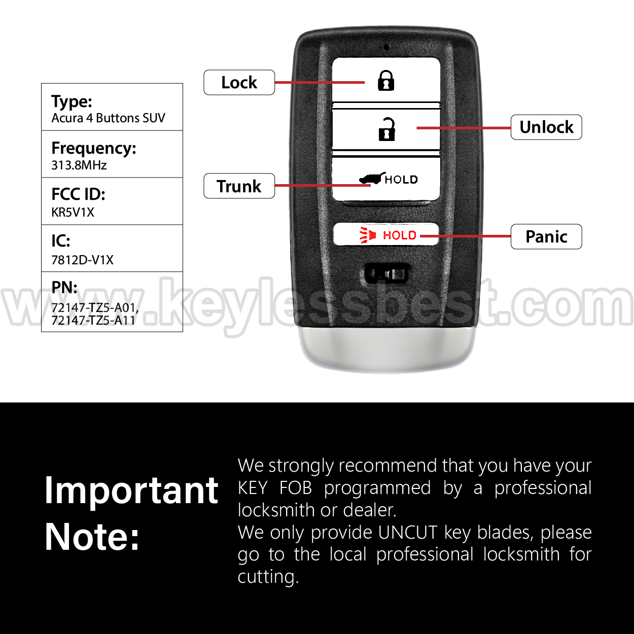 *The detailed information of this 2014 – 2020 Acura keyless remote fob is as follows. Please confirm the following details match your vehicle before ordering: FCC ID , Part Number , Year Model ,IC, Frequency, Chip, and Buttons.