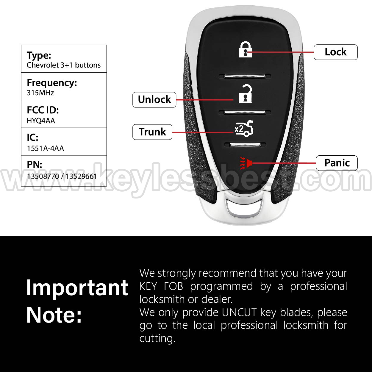 *The detailed information of this 2016-2020 Chevrolet keyless remote fob is as follows. Please confirm the following details match your vehicle before ordering: FCC ID , Part Number , Year Model ,IC, Frequency, Chip, and Buttons.