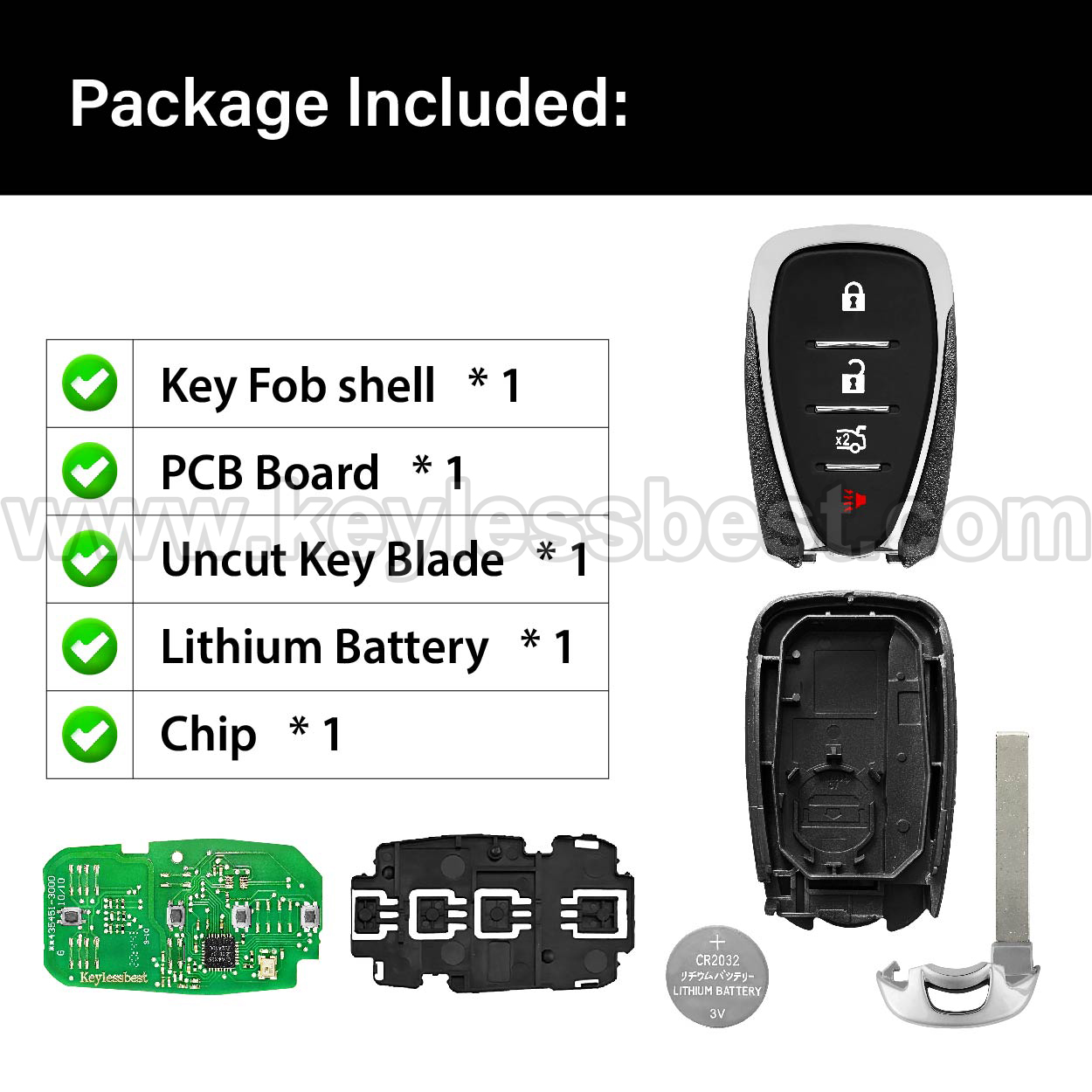 - The 2016-2020 Chevrolet smart keyless entry fob replacement – without a logo, with an uncut emergency insert key included.