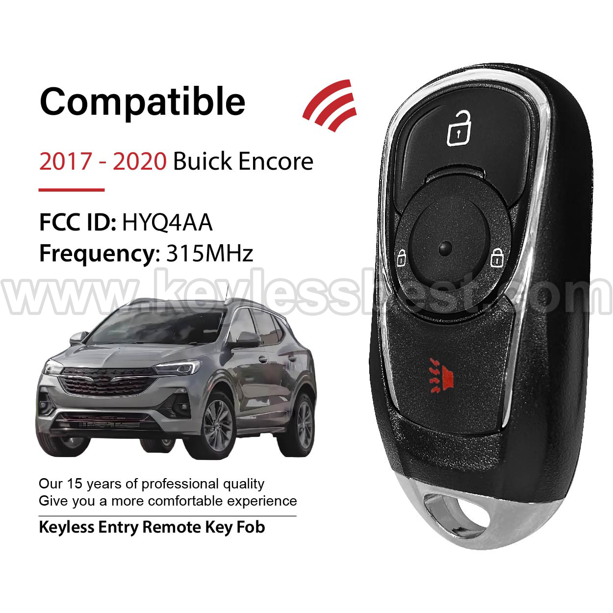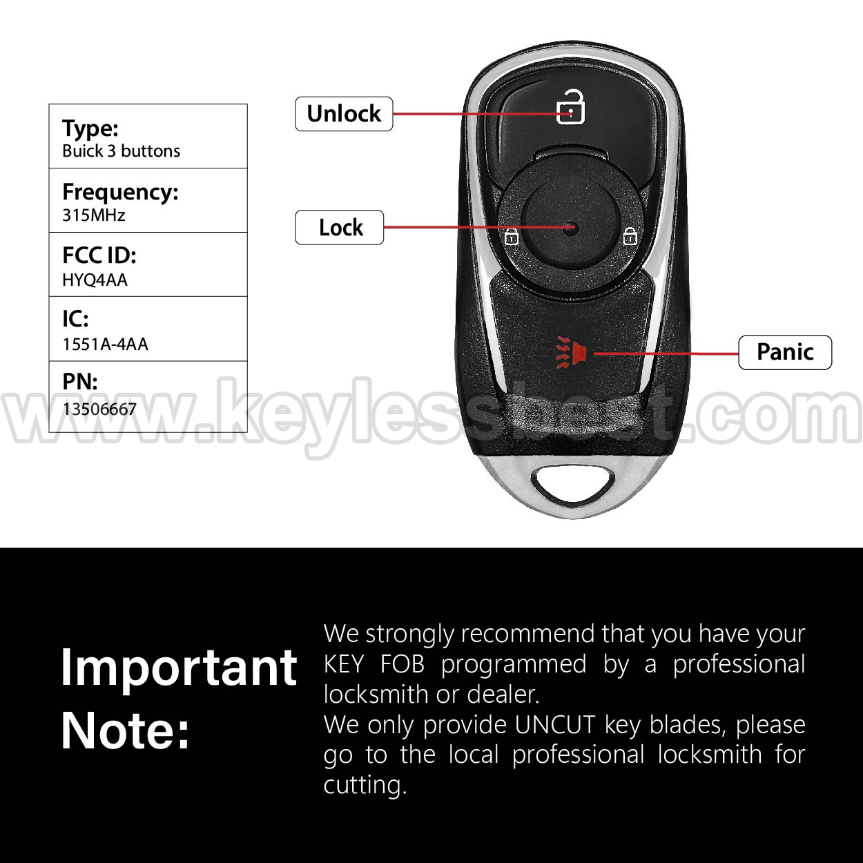 *The detailed information of this 2017-2020 Buick keyless remote fob is as follows. Please confirm the following details match your vehicle before ordering: FCC ID , Part Number , Year Model ,IC, Frequency, Chip, and Buttons.