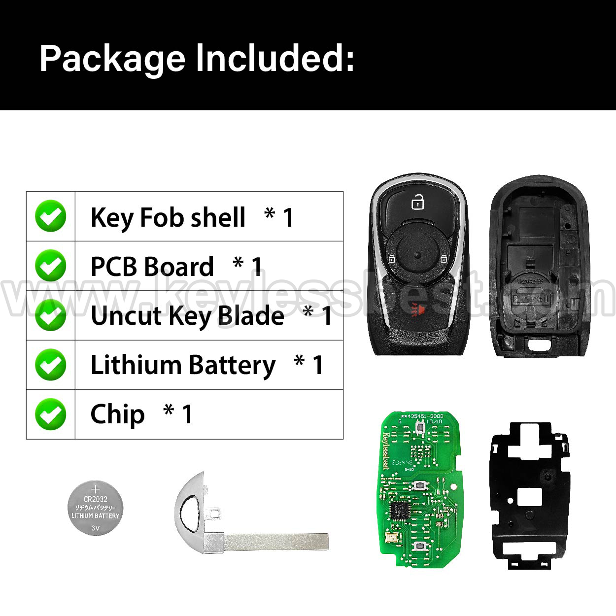 - The 2017-2020 Buick smart keyless entry fob replacement – without a logo, with an uncut emergency insert key included.