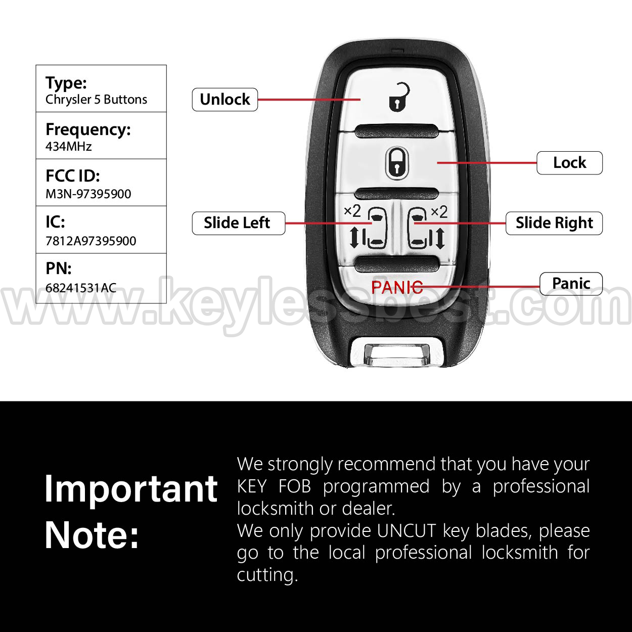 *The detailed information of this 2017-2024 Chrysler keyless remote fob is as follows. Please confirm the following details match your vehicle before ordering: FCC ID , Part Number , Year Model ,IC, Frequency, Chip, and Buttons.