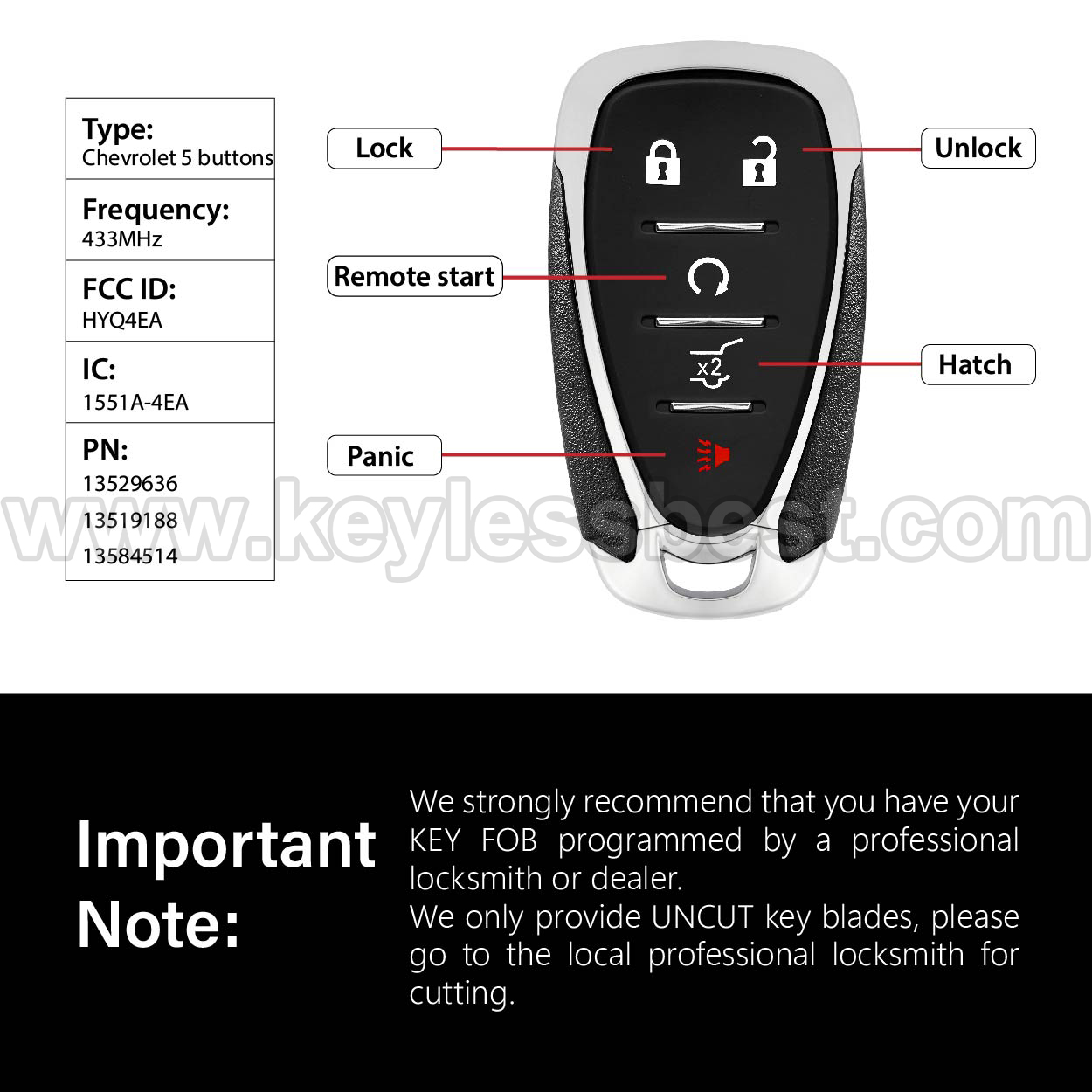 *The detailed information of this 2018-2020 Chevrolet keyless remote fob is as follows. Please confirm the following details match your vehicle before ordering: FCC ID , Part Number , Year Model ,IC, Frequency, Chip, and Buttons.