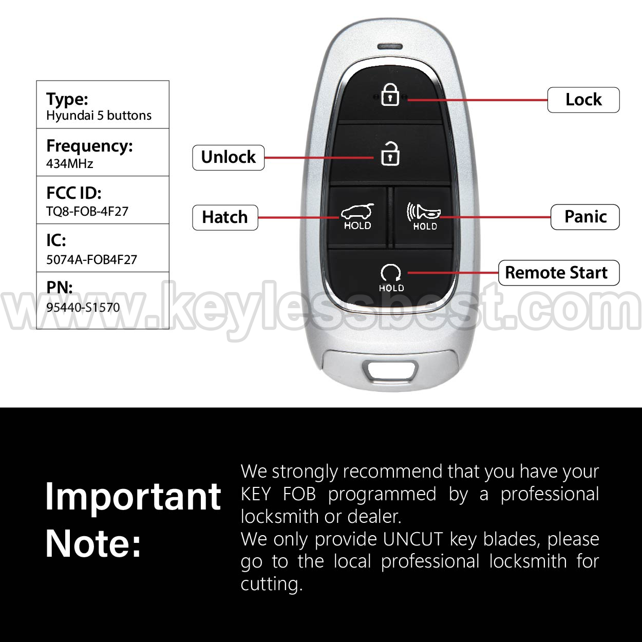 *The detailed information of this 2021 – 2022 Hyundai keyless remote fob is as follows. Please confirm the following details match your vehicle before ordering: FCC ID , Part Number , Year Model ,IC, Frequency, Chip, and Buttons.