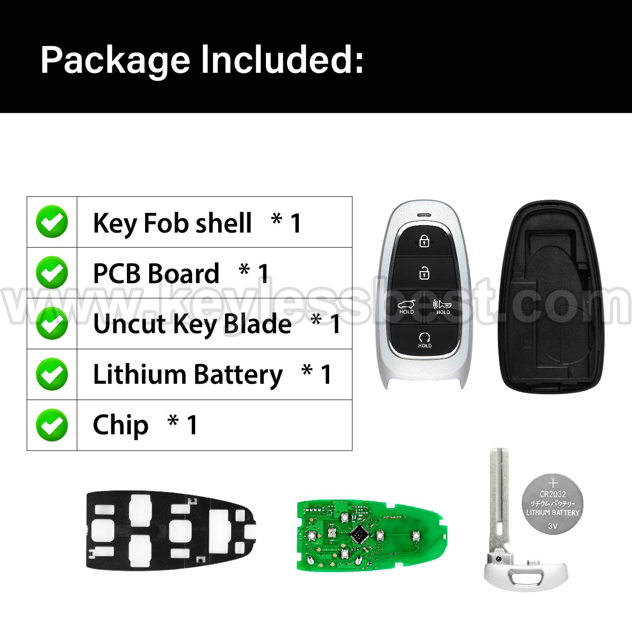 - The 2021-2022 Hyundai smart keyless entry fob replacement – without a logo, with an uncut emergency insert key included.