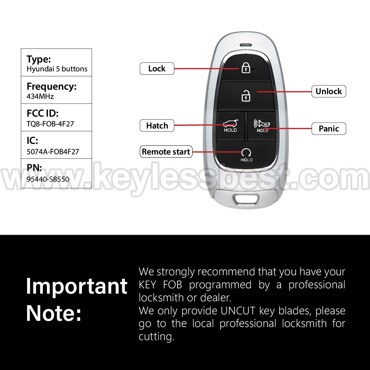 *The detailed information of this 2022-2024 Hyundai keyless remote fob is as follows. Please confirm the following details match your vehiclebefore ordering: FCC ID , Part Number , Year Model , IC , Frequency, Chip, and Buttons.